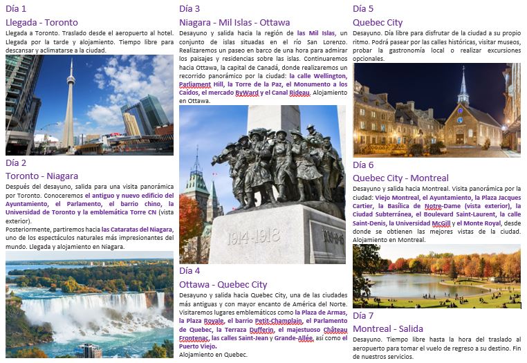 Desayuno y salida hacia Montreal. Visita panorámica por la ciudad: Viejo Montreal, el Ayuntamiento, la Plaza Jacques Cartier, la Basílica de Notre-Dame (vista exterior), la Ciudad Subterránea, el Boulevard Saint-Laurent, la calle Saint-Denis, la Universidad McGill y el Monte Royal, desde donde se obtienen las mejores vistas de la ciudad.