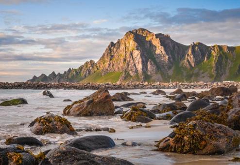 Al terminar continuaremos camino hacia el sur de las islas, donde disfrutaremos de playas hermosas como la de Ramberg, con su arena blanca y las montañas de la isla de Moskenesøya al fondo.
