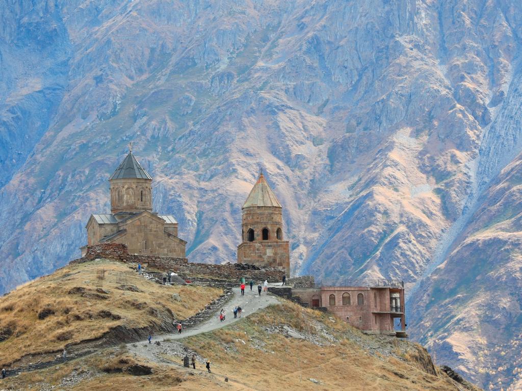 Desayuno en el hotel. Hoy nos espera una de las actividades/visita mas importantes del viaje, la subida hasta la Iglesia de la Santísima Trinidad de Gergeti. El ascenso nos llevará a través del pintoresco pueblo de Gergeti y un idílico bosque de abedules. Desde la iglesia, si el clima lo permite, podremos admirar el majestuoso Monte Kazbek, de 5054 metros de altura, también conocido como la Perla Blanca del Cáucaso. El recorrido completo de ida y vuelta dura aproximadamente 3 horas, cubriendo una distancia de aproximadamente 5 kilómetros. El ascenso y el descenso cubren ambos 445 metros. ¡Embarquémonos en este encantador viaje y disfrutemos de la belleza del Cáucaso! (*si alguien no puede hacer la subida se proporcionará un coche para la misma)