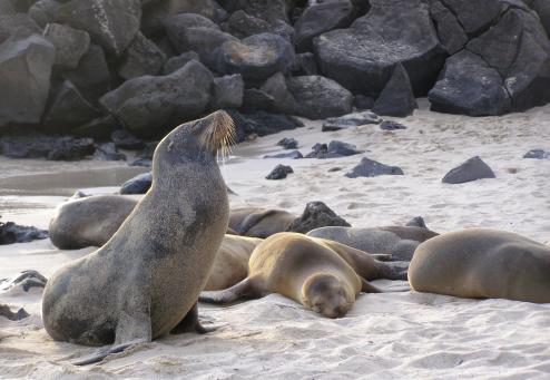 North Seymour es una isla con mucha vida y es un gran sitio de visitantes en Galápagos. Puede que tenga que ceder el paso a un león marino o una iguana marina. Los piqueros de patas azules anidan a ambos lados del sendero donde las posibles parejas realizan su baile de cortejo. Más lejos a lo largo de la orilla rocosa, un cordón de arena blanca se encuentra en el interior, y grandes bandadas de aves marinas se mezclan en el frenesíes de alimentación, dibujando un cuadro excepcional. El rastro en la isla de Seymour del Norte da vuelta al interior para revelar el sitio donde se reúne la especie más grande de pájaro en las Galápagos. Estos enormes y oscuros acróbatas tienen una envergadura de 5 pies, y los machos, con bolsas inflables de escarlata en garganta, se sientan en arbustos bajos para vigilar a sus polluelos igualmente grandes.