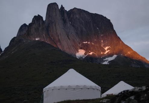 Noche en campamento junto a la mole del Ulamertorsuaq, una de las paredes más verticales y grandes del mundo, superior al Capitán en Yosemite, donde se encuentran acampados generalmente los escaladores que están subiendo los grandes muros de la zona. Todo este fiordo está considerado como una de las “diez maravillas del Ártico”.
